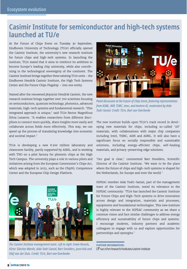 HiPEAC magazine wrote an article for the launch of the new Casimir Institute at TU/e, showcasing the university’s new research institute for future chips and high-tech systems. In launching the institute, TU/e stated that it aims to reinforce its ambition to become Europe’s leading chip university, while also contributing to the technological sovereignty of the continent. Read the full article here.